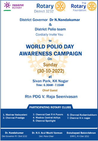 Home Rotary End Polio Now Campaign Organised by District 3232 on 30th October-22 at... Rotary End Polio Now Campaign Organised by District 3232 on 30th October-22 at Shivan Park KK nagar By RCMV.ORG - Admin - November 3, 2022 1454 0 Facebook Twitter Pinterest WhatsApp End Polio Now Campaign Organised by District 3232 on 30th October-22 at Shivan Park KK nagar RCM Vadapalani was the lead club at the venue. Sponsor: Rotary club of Madras Vadapalani Time: 6.30am to 7.30am