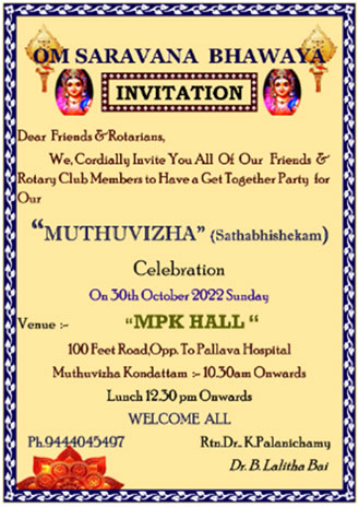 Home Rotary Muthu Vizha (Sadhaabhishekam) Function of Rtn Dr Palanichamy and Dr Lalitha Bai... Rotary Muthu Vizha (Sadhaabhishekam) Function of Rtn Dr Palanichamy and Dr Lalitha Bai on Sunday, 30th October at 10.30am at MPK Hall, Vadapalani By RCMV.ORG - Admin - November 3, 2022 1495 0 Facebook Twitter Pinterest WhatsApp Muthu Vizha (Sadhaabhishekam) Function of Rtn Dr Palanichamy and Dr Lalitha Bai on Sunday, 30th October at 10.30am at MPK Hall, Vadapalani Time: 10.30am to 12.30pm