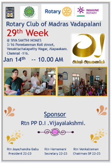 Home Service Projects RCMV Anbum Aravanaipum Project on 14th January 2023 at Siva Shakthi Homes... Service Projects RCMV Anbum Aravanaipum Project on 14th January 2023 at Siva Shakthi Homes Valasaravakkam, Chennai By RCMV.ORG - Admin - January 23, 2023 1555 0 Facebook Twitter Pinterest WhatsApp RCMV Anbum Aravanaipum Project on 14th January 2023 at Siva Shakthi Homes Valasaravakkam, Chennai Sponsor: PP Rtn Vijayalakshmi Sponsored for: Food for 18 mentally challenged inmates