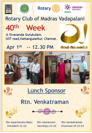 Home Service Projects RCMV Anbum Aravanaipum Project on 1st April, 2023 at Sivananda Gurukulam... Service Projects RCMV Anbum Aravanaipum Project on 1st April, 2023 at Sivananda Gurukulam Kattangulathur, Chennai By RCMV.ORG - Admin - April 13, 2023 1681 0 Facebook Twitter Pinterest WhatsApp RCMV Anbum Aravanaipum Project on 1st April, 2023 at Sivananda Gurukulam Kattangulathur, Chennai Sponsor: Rtn Venkataraman Time: 12.30pm Sponsored for: Lunch for 200 orphaned and less privileged Children