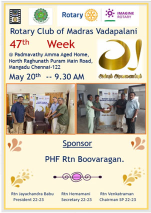 Home Service Projects RCMV Anbum Aravanaipum Project on 20th May, 2023 at Padmavathy Amma... Service Projects RCMV Anbum Aravanaipum Project on 20th May, 2023 at Padmavathy Amma Aged Home, Mangaadu, Chennai By RCMV.ORG - Admin - May 29, 2023 1715 0 Facebook Twitter Pinterest WhatsApp RCMV Anbum Aravanaipum Project on 20th May, 2023 at Padmavathy Amma Aged Home, Mangaadu, Chennai Sponsor: Rtn Boovaragan Time: 9.30 am Sponsored for: Dry rations covering Rice, Dhall, Oil, Flour, Sugar and other daily essential needs