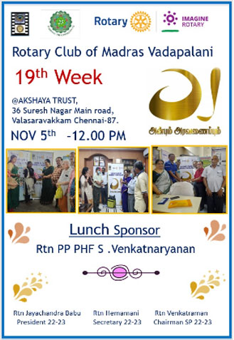 Home Service Projects RCMV Anbum Aravanaipum project on 5th November-22 at Akshaya Trust, Valasaravakkam,... Service Projects RCMV Anbum Aravanaipum project on 5th November-22 at Akshaya Trust, Valasaravakkam, Chennai By RCMV.ORG - Admin - November 9, 2022 1478 0 Facebook Twitter Pinterest WhatsApp RCMV Anbum Aravanaipum project on 5th November-22 at Akshaya Trust, Valasaravakkam, Chennai Sponsor: Rtn PP Venkatanarayanan Sponsored for: Lunch for the day