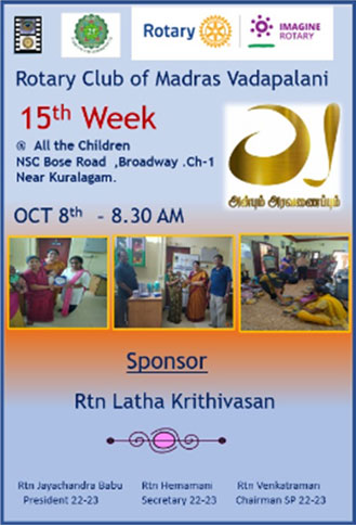 Home Service Projects RCMV Anbum Aravanaipum Project on 8th October-22 at All the Children Senior... Service Projects RCMV Anbum Aravanaipum Project on 8th October-22 at All the Children Senior Citizens Home at NSC Bose Road, Chennai By RCMV.ORG - Admin - October 10, 2022 1414 0 Facebook Twitter Pinterest WhatsApp RCMV Anbum Aravanaipum Project on 8th October-22 at All the Children Senior Citizens Home at NSC Bose Road, Chennai Sponsor: Rtn Latha Krithivasan Sponsored for: Day to day needs for home inmates
